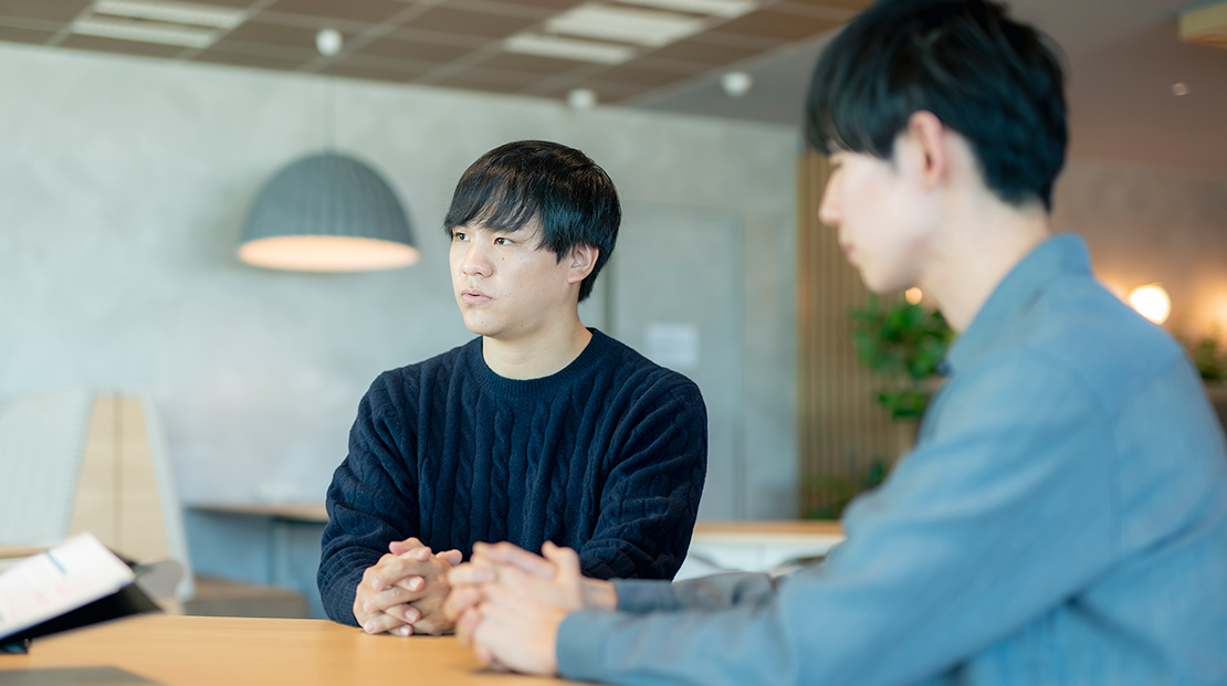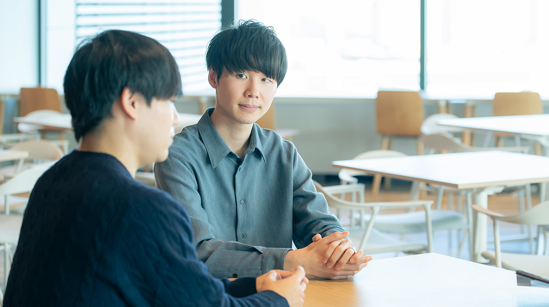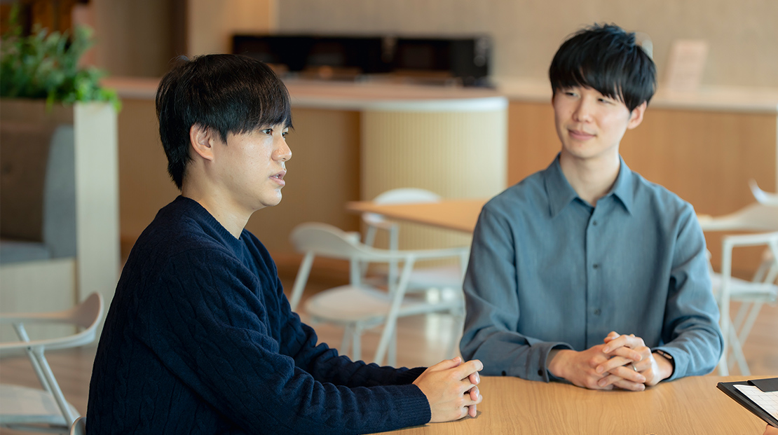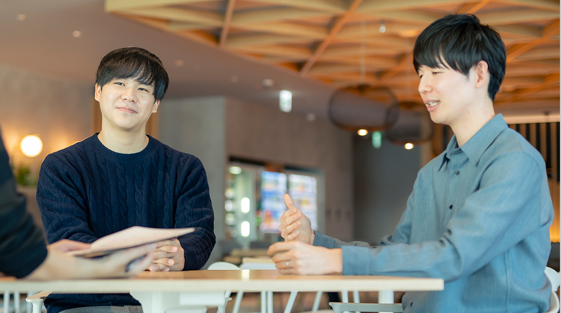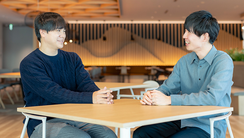 - 初めて「理系出身」という同じバックグラウンドがあると知ったときは、嬉しかったし親近感を抱きましたね。今は、培ってきた専門性をさらに高めて業務に活かそうとする彼の姿勢を、同期として、仲間として尊敬しています。