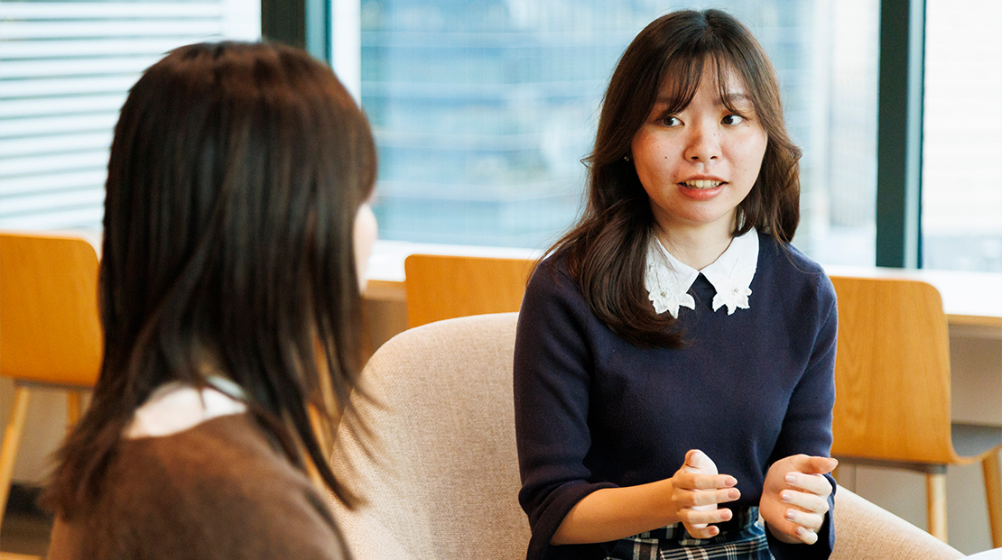 - 金融業界に勤めていた私の母は結婚・出産を機に退職していたので、上席の女性は少ないイメージを抱いていました。でも実際に入社してみると、運用部門でも女性の管理職が活躍されていたり、所属部署も4割ほどが女性社員だったりと、「女性であること」が特別ではなく、働く上で性差が気になったことは一度もありません。育児休暇や時差勤務などの制度も広く活用されていて、子育てする社員が働き続けやすい環境が整備されているように思います。